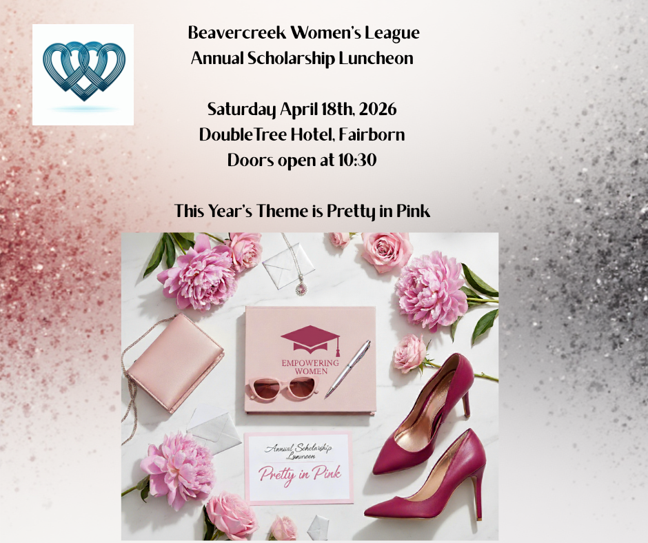 April 18, 2026 Beavercreek, Ohio FOR IMMEDIATE RELEASE February 18th, 2026 MEDIA Contact: Pat Barton, beavercreekwomensleague@gmail.com Beavercreek Women’s League hosts scholarship luncheon The Beavercreek Women’s League (BWL) hosts their 42nd annual Scholarship Luncheon on Sat. April 18 from 10:30-2 at the DoubleTree by Hilton in Fairborn. This highly anticipated event, with the theme “Pretty In Pink,” promises to be an unforgettable experience for all attendees. The BWL Scholarship Luncheon is a significant fundraiser for the organization, aimed at providing financial assistance to senior students from Beavercreek High School’s Class of 2026, as well as adult Greene County women pursuing higher education as non-traditional students. For more than three decades, BWL has been awarding scholarships to exceptional graduating seniors who demonstrate academic excellence, active involvement in school and community activities, financial need, and potential for success in college. The organization firmly believes in recognizing and supporting individuals who possess the drive and determination to make a positive impact on our community. The funds raised from the luncheon will directly support Beavercreek High School students as well as “Women in Transition” who are pursuing higher education at Wright State University and Clark State College. For further information, ticket purchases, or to make a contribution, visit Beavercreek Women’s League website at Beavercreek Women's League - Events, Scholarship Luncheon Beavercreek Women's League - Women's Community Organization