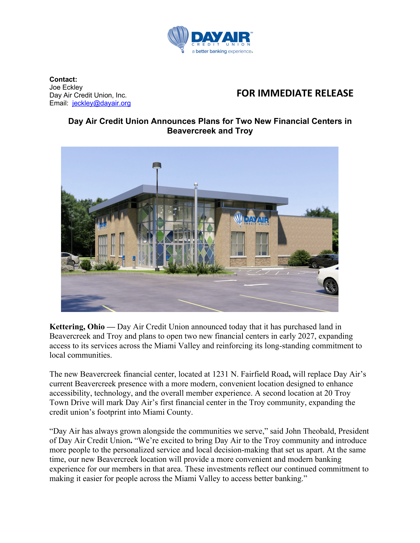 Day Air Credit Union Announces Plans for Two New Financial Centers in Beavercreek and Troy