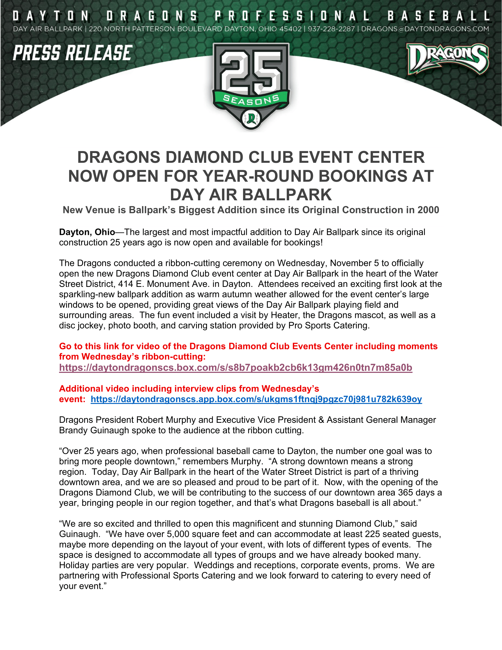 For Immediate Release Contact: Tom Nichols, Director of Media Relations 937-228-2287, x140, tom.nichols@daytondragons.com Dayton, Ohio (July 23, 2025) —The Dayton Dragons announced today that Day Air Ballpark has been selected as the winner of the 2025 Newsweek Fans’ Choice Award for Best Single-A Ballpark in the United States. This award follows the recent selection of the Dragons as the First-Place winner in the Dayton Daily News “Best of Dayton” contest in two categories: “ Best Attraction ” and “ Best Family Fun Destination. ” “We are very pleased to be named best ballpark by a publication as distinguished as Newsweek,” noted team president Robert Murphy. “While we work extremely hard to keep everything first class and professional, we really have to tip our caps to our corporate partners, season ticket holders, group leaders, and the entire community for helping us keep this building sold out for the past 25 seasons. It is truly remarkable what has been built here in downtown Dayton … we have the best fans in sports.” There are many things that contributed to Day Air Ballpark winning this award: The stadium was designed incredibly well. Every seat is close to the action; there is not a bad seat in the house. There are numerous hospitality options available with 25 suites, three party decks, and one larger all-inclusive, hospitality area located over the leftfield wall, called the “Dragons Lair.” Over 6,300 stadium-style theater seats, complete with arm rests, and cupholders. Three overflow lawn seating areas that are great for groups and families. The stadium concessionaire does a terrific job with both catering and concessions options offering fresh cooked foods, and many local and nationally branded offerings, such as Mar-Chele Pretzels, Donatos Pizza, Dip N’ Dots, Kona Ice, Graeter’s, Pepsi, and Anheuser-Busch products. The 7-story HD video board compliments a larger entertainment emphasis with three mascots, a complete 10-person “Green Team” leading the in-game entertainment, over 300 skits and entertainment options for the two-minute, in-between inning breaks, and much more that create laughs, smiles, and memories for fans at Day Air Ballpark. Behind the outfield wall is a Fun Zone for kids with carnival games and inflatables. The Dragons brand of “unsurpassed customer service” has been recognized locally with many is awards from local media and business organizations in the Dayton region. The stadium has a multi-million-dollar entertainment control room and in-house TV studio that allows the team to produce and broadcast its own TV games. The stadium is located in Downtown Dayton. Day Air Ballpark lies in the heart of the Water Street District, making downtown a great and thriving place to live, work, and play. The ballpark has major freeway and surface street access making getting to the ballpark remarkably simple and easy. And the ballpark has over 6,000 street, public, and private parking options just ¼ of a mile from the main entry gates. Dragons ownership has contributed over $20M back into the ballpark in repairs and maintenance and capital improvements over the past 25 seasons keeping it updated and fresh for fans. Since 2021, a $20M public/private funding plan has produced a brand-new state-of-the-art playing field, updated stadium lighting system, a new state-of-the-art sound system with over 500 speakers, over 240 feet of outfield and fascia LED signage for game info and entertainment, new roof, new HVAC heating and air systems, and a brand-new $6M Diamond Club event center (scheduled to open September 15, 2025) that will be used for Dragons games and year-round for hosting of business meetings, social events, wedding receptions, and holiday parties. Through this weekend’s games, the Dragons lead Minor League Baseball’s Single-A level (60 teams) in attendance, averaging 7,756 per home date. The Dragons currently rank #2 among all levels of the minor leagues (120 teams) in attendance average. Their total attendance to date is 310,239 with 24 scheduled home games to play this season. The Dragons have led the Single-A level (60 teams) in attendance for all 24 seasons of their existence and finished in the top 10 among all levels in every season since their first year of operation in 2000. In 2024, the Dragons finished the year ranked #3 among all levels of Minor League Baseball. About Diamond Baseball Holdings: The Dragons ownership group, Diamond Baseball Holdings (DBH), was formed in 2021 to support, promote and enhance Minor League Baseball Clubs affiliated with Major League Baseball through professional management, best practices, innovation, and investment. *Approved Dragons marks, logos, photos, and videos can be found here: https://daytondragonscs.box.com/s/vawqwub6gite6ajcinn14j6k6eb73tj9 More Information: The Dayton Dragons are the affiliate of the Cincinnati Reds and play 66 home games at beautiful Day Air Ballpark, in the heart of the Water Street District. Contact the Dragons by calling at (937) 228-2287, emailing at dragons@daytondragons.com , or go to daytondragons.com. For more information, please visit the following links: 2025 Schedule: https://www.milb.com/dayton/tickets/gameplanschedules Season Tickets: https://www.milb.com/dayton/tickets/seasontickets Group and Hospitality Options: https://www.milb.com/dayton/tickets/groupoutings The Dragons sellout streak is active and stands at 1,613 consecutive games. The streak is a testament to the Dayton area community. Support the Dayton Dragons and become a Dragons season ticket holder.